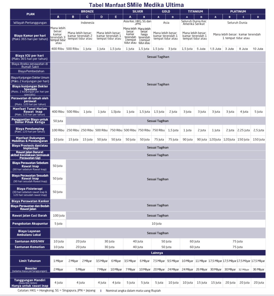 Tabel manfaat dan perbandingan masing masing plan/paket dari Asuransi Kesehatan Smile Medika Ultima