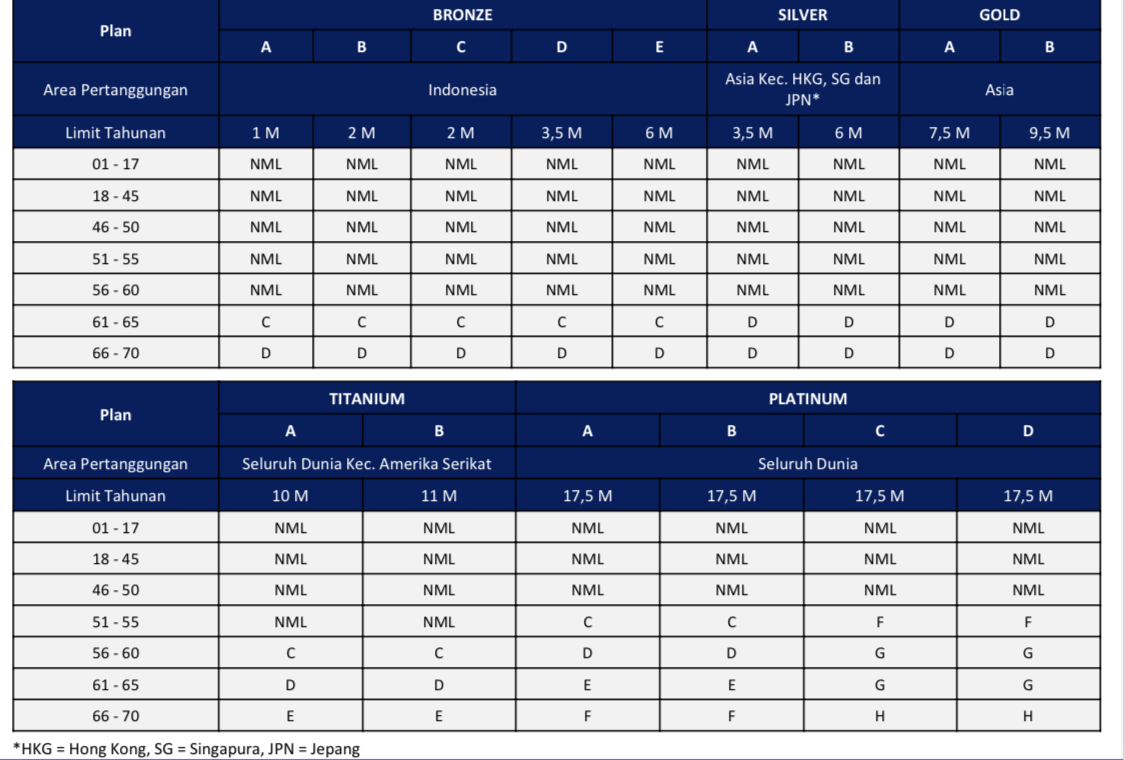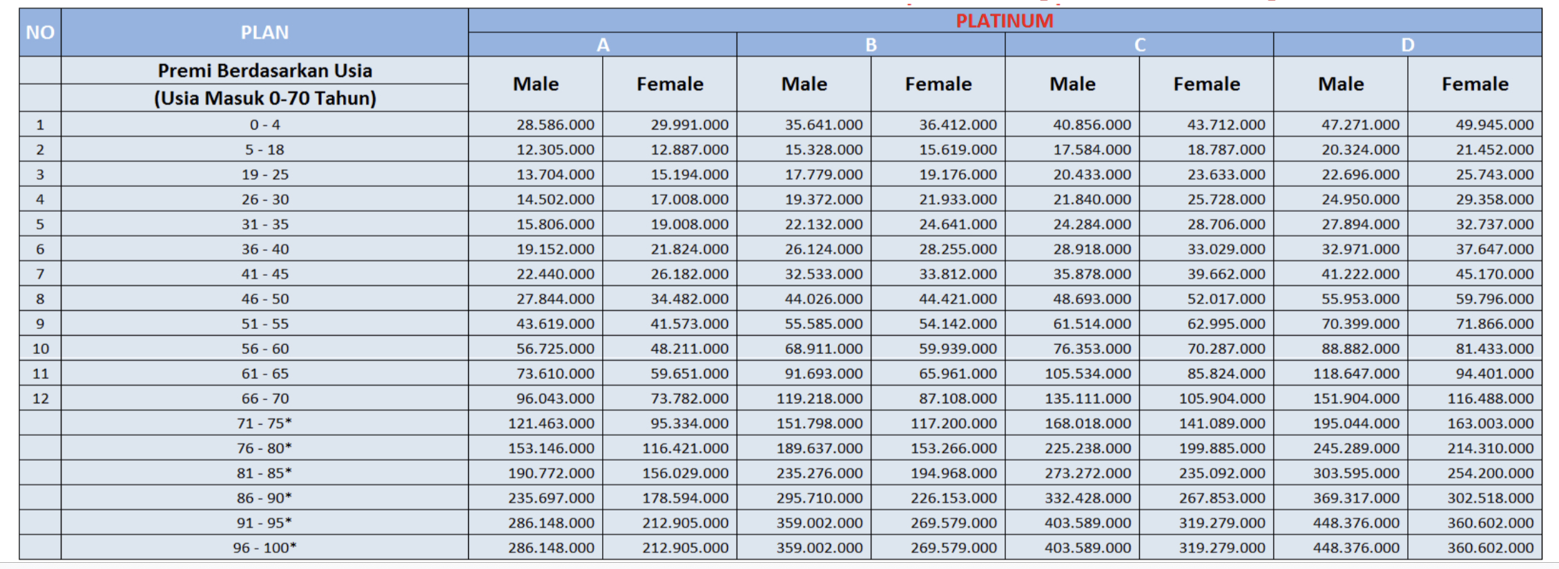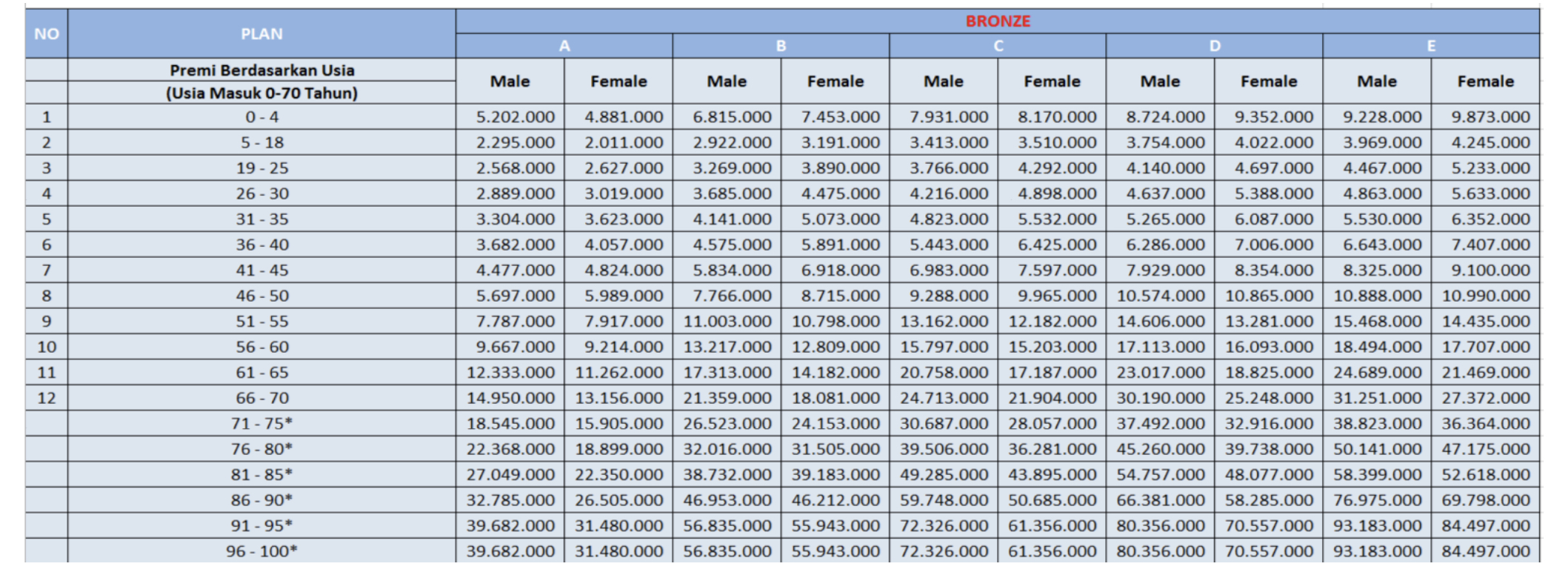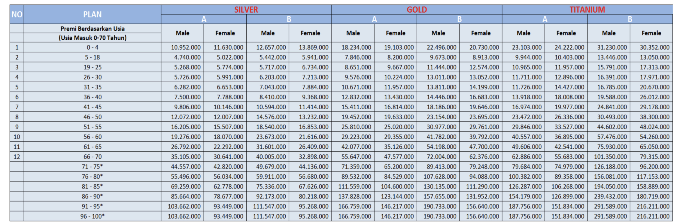 Pertama tama tentukan plan/paket yang Anda inginkan. Kemudian lihat kolom jenis kelamin (male/pria atau female/wanita) kemudian pilih baris berdasarkan rentang usia saat ini.