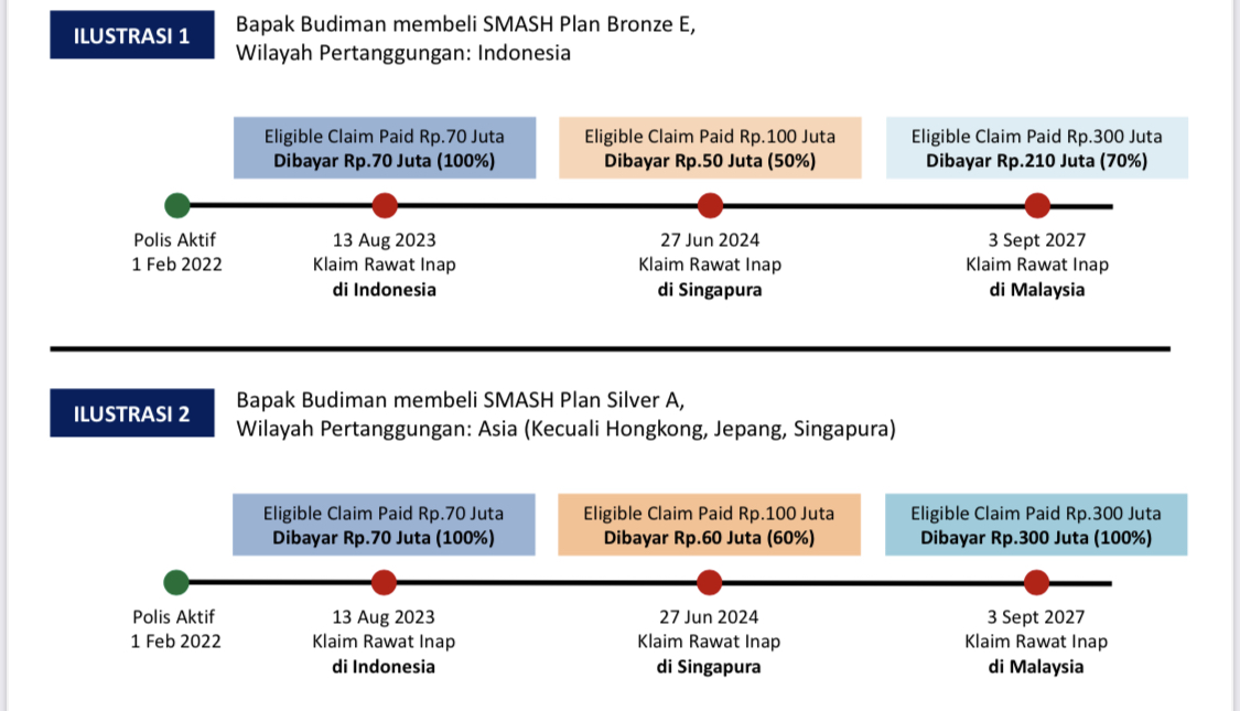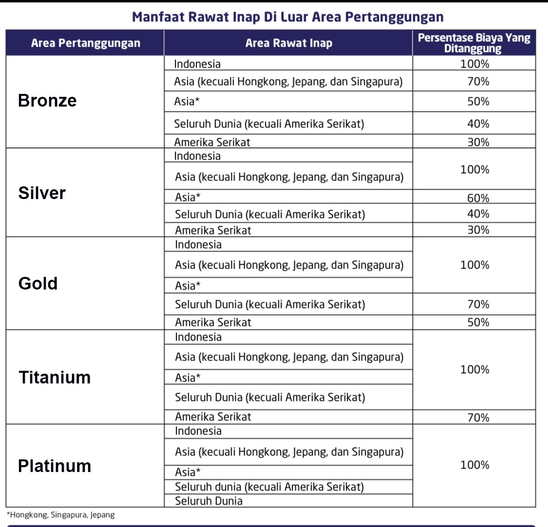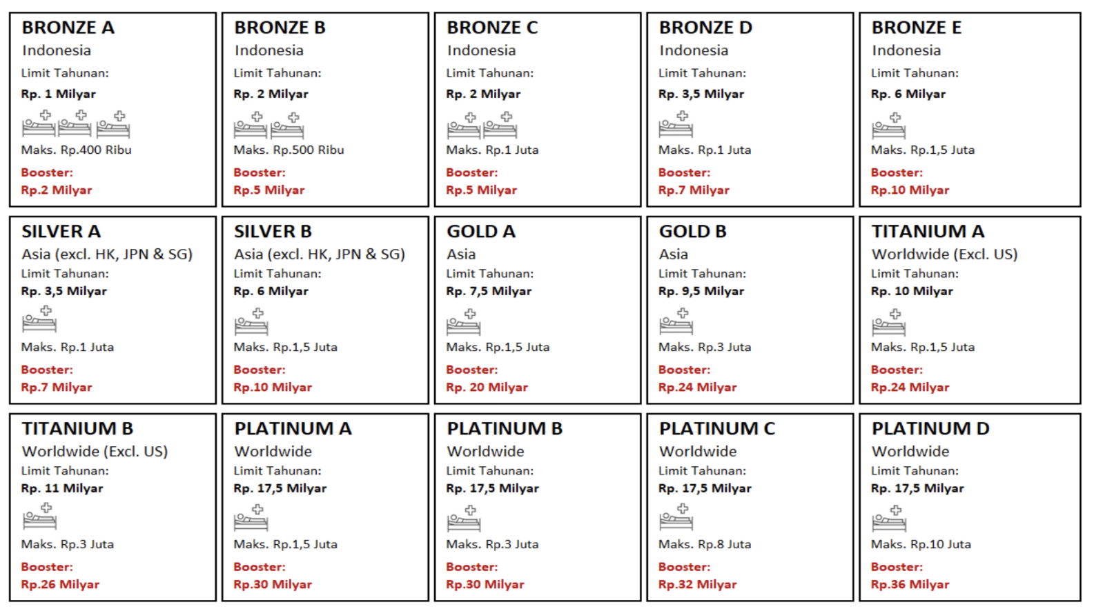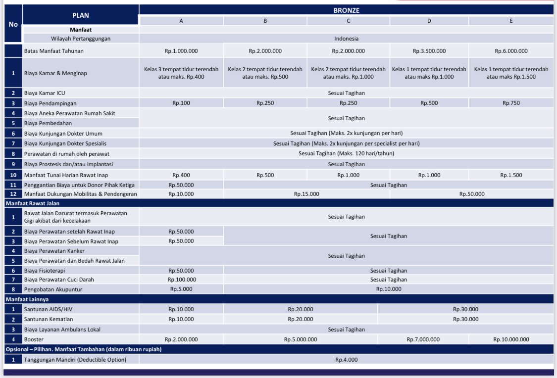 Plan Bronze (A s/d E) mengcover biaya rawat inap/bedah sebesar 100% dari total tagihan (as charge sesuai bill alias full cover) di Indonesia, 70% dari total tagihan di seluruh negara Asia kecuali di Singapura, Hongkong. Jepang, 50% dari total tagihan di Singapura, Hongkong, Jepang, 40% dari total tagihan di seluruh dunia kecuali Amerika, 30% dari total tagihan di Amerika.