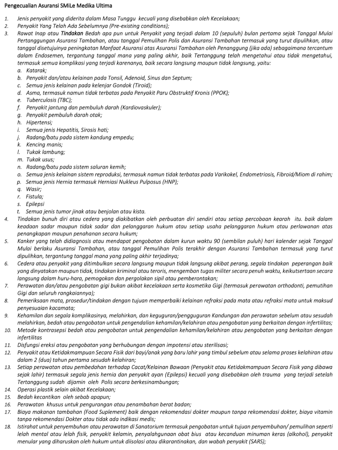 Berikut ini adalah pengecualian dari Asuransi Kesehatan Smile Medika Ultima :
