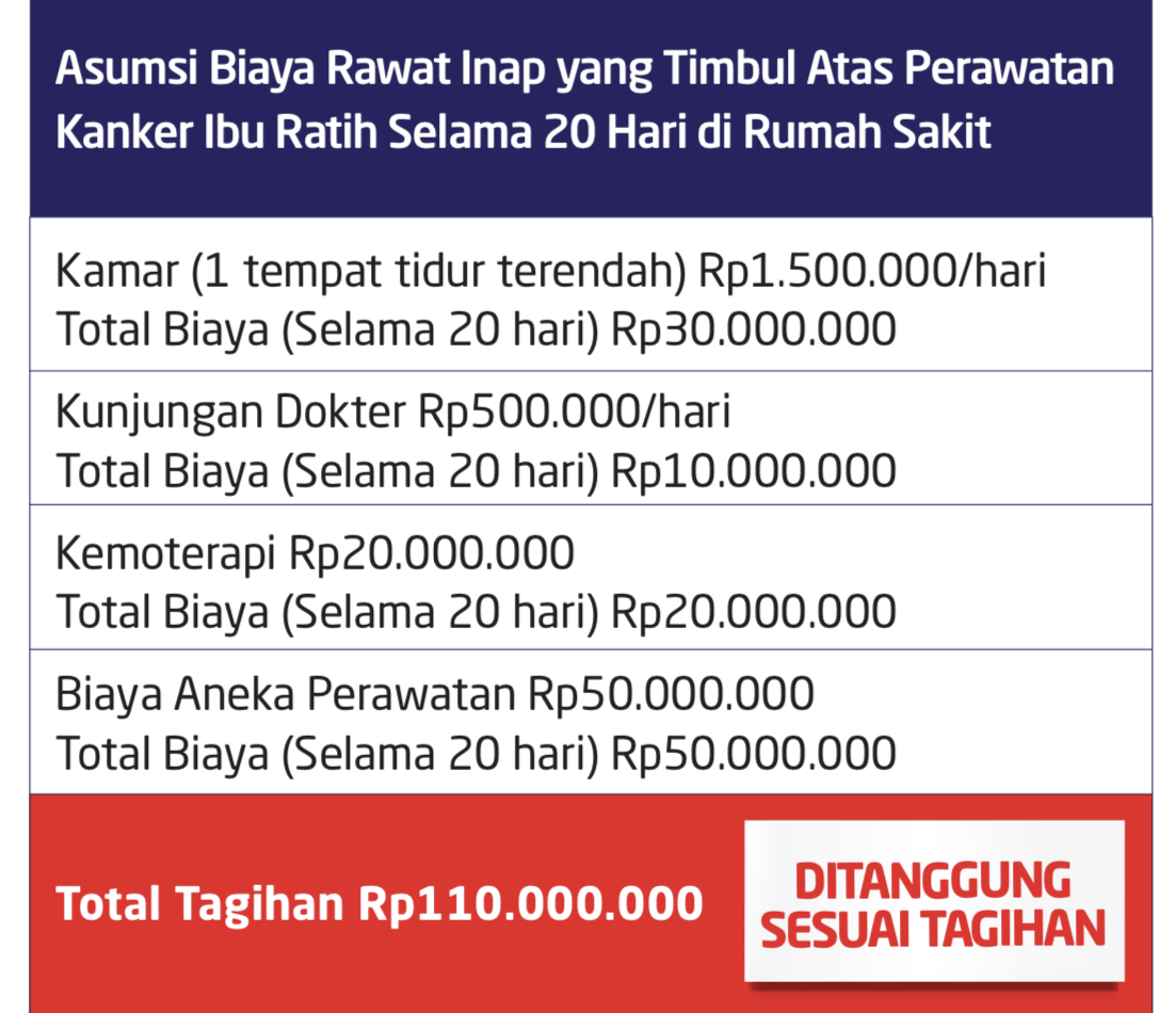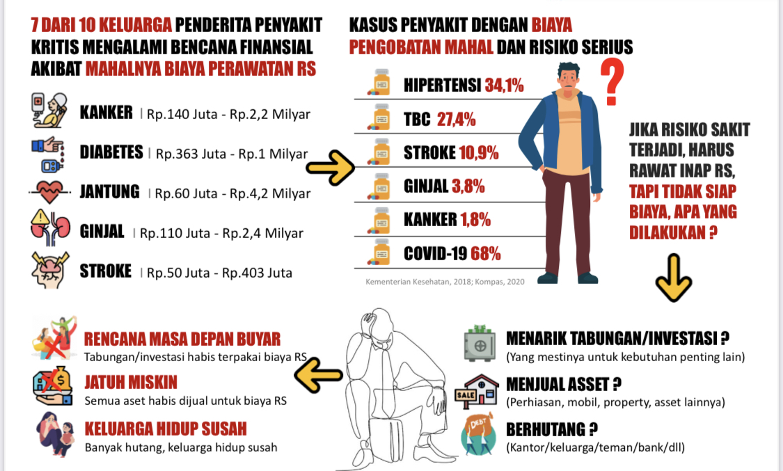 Pastinya Anda akan mengorbankan anggaran lain untuk membayar tagihan bill rumah sakit. Akibatnya banyak masalah yang akan muncul di kemudian hari seperti tunggakan dari berbagai tagihan rutin di rumah, berbagai kebutuhan dapur tidak dapat terpenuhi, atau bahkan biaya sekolah/kuliah anak-anak menjadi terancam akibat adanya musibah ini.