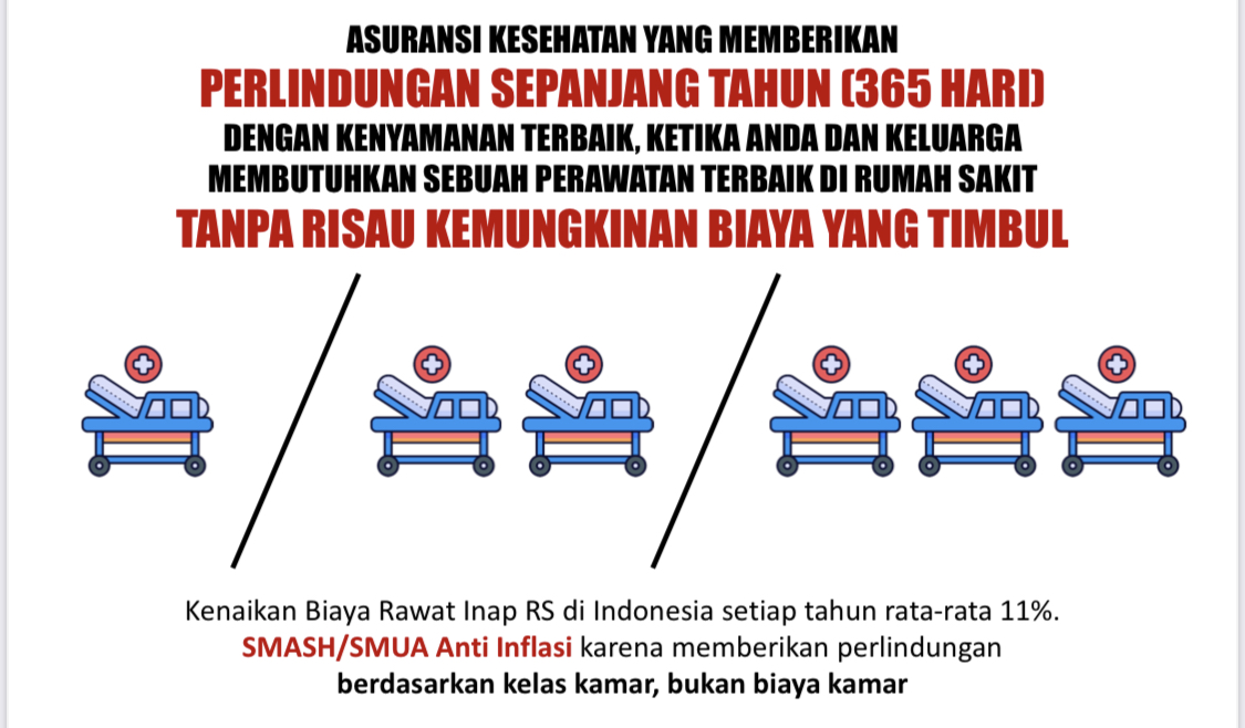 Asuransi Kesehatan Smile Medika Ultima ini adalah asuransi kesehatan Anti Inflasi yang artinya meskipun biaya rumah sakit naik setiap tahun nya namun tidak akan mempengaruhi manfaat yang akan dicover karena bisa di tanggung 100% sesuai tagihan asalkan kamar yang diambil sesuai dengan plan/paket yang dipilih.