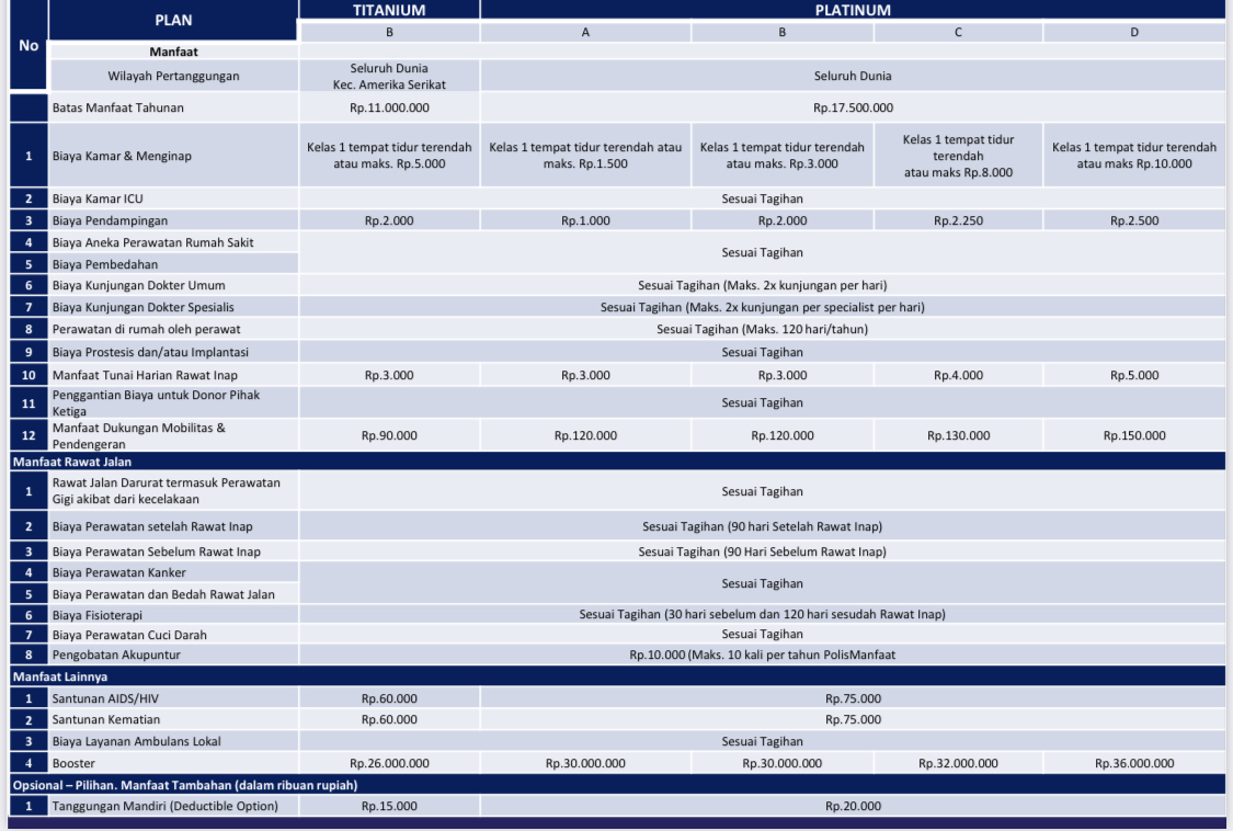 Plan Titanium (A dan B) mengcover biaya rawat inap/bedah sebesar 100% dari total tagihan (as charge sesuai bill alias full cover) di Indonesia dan seluruh dunia kecuali Amerika, 70% dari total tagihan di Amerika.