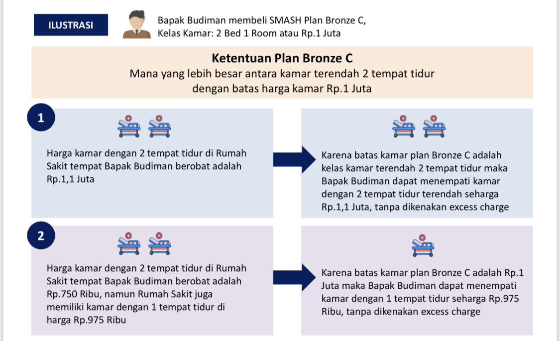 Jika Anda memilih plan Bronze B maka Anda berhak menempati kamar 2 bed terendah/termurah di rumah sakit tujuan Anda tanpa mempedulikan berapa tarif kamar sebenarnya dari kamar tersebut jika dinominalkan. Misalnya tarif kamar 2 bed terendahnya ternyata 750.000 per hari maka Anda berhak menempatinya dan seluruh biaya seperti dokter, obat obatan dan pemeriksaan diagnostik selama dirawat inap akan dicover full seluruhnya sesuai tagihan (asalkan belum melebihi limit tahunan Rp. 6 M + limit Booster 30 M). Keren kan.