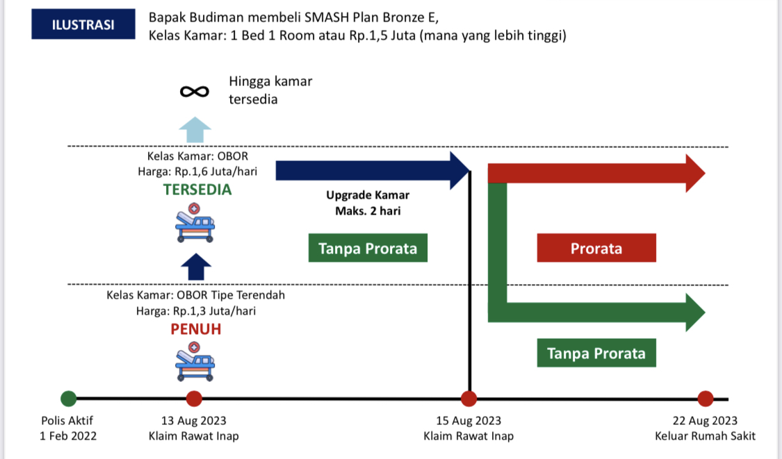 Kecuali jika saat mau dirawat, kelas kamar yang sesuai plan Anda penuh maka Anda diperbolehkan upgrade ke kamar 1 kelas di atas kamar yg sesuai plan Anda selama maksimal 2 hari. Setelah 2 hari Anda harus downgrade kembali ke kelas kamar yang sesuai plan Anda atau jika tidak maka biaya rumah sakitnya akan dikenakan prorata (tidak dicover full sesuai tagihan).