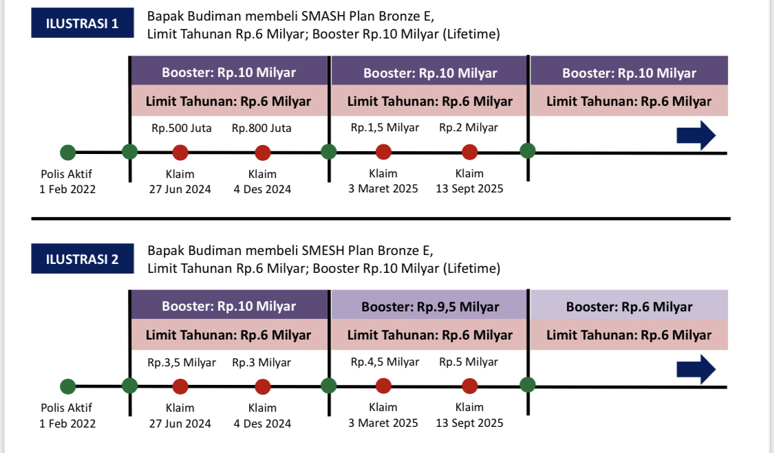 Contohnya Anda memilih Plan Silver B yang limit tahunannya Rp. 6 M dan limit booster nya Rp.10 M. Tahun ini Anda dirawat di RS dan sudah menghabiskan biaya Rp. 7 M sehingga limit tahunan Anda sudah habis dan limit booster Anda tersisa Rp. 9 M. Di tahun depan, limit tahunan Anda akan terisi kembali secara otomatis menjadi Rp. 6 M tetapi limit booster Anda tetap di angka Rp. 9 M.