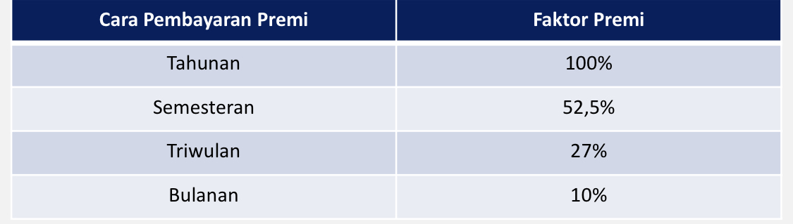 Premi kwartalan lebih murah dibandingkan premi bulanan. Premi semesteran lebih murah dibandingkan premi kwartalan dan premi bulanan. Premi tahunan lebih murah dibandingkan premi semesteran, premi kwartalan dan premi bulanan. Jadi premi tahunan tetap yang paling murah dibandingkan dengan opsi pembayaran premi lainnya.