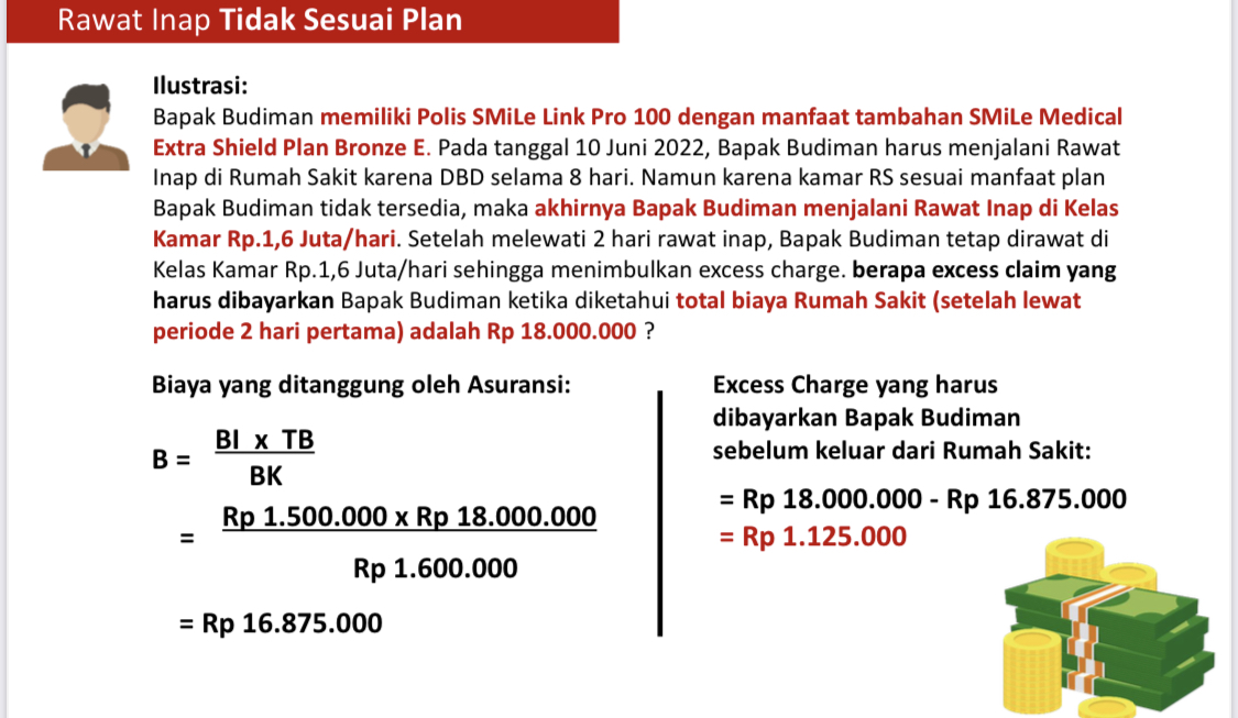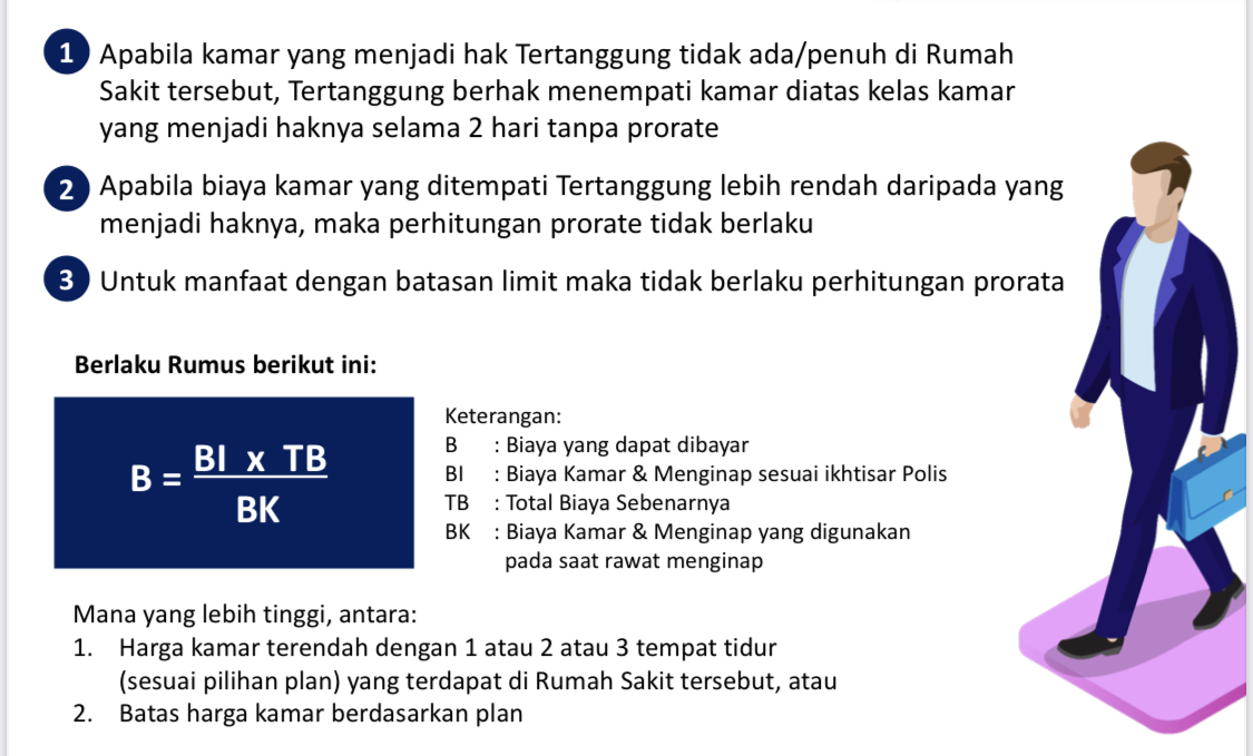 Apa yang terjadi jika Anda mengambil kamar yang tidak sesuai plan? Misal Anda memilih plan Bronze B tapi malah memilih kamar 1 bed. Maka jadinya seluruh biaya selama Anda dirawat di RS tidak akan dicover full sesuai tagihan namun jadinya dihitung secara prorata. Artinya sebagian dicover asuransi dan sebagian lagi jadi biaya yang mesti Anda bayarkan sendiri.