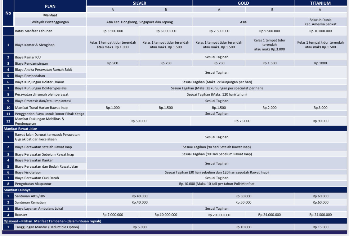Apa saja manfaat yang ditanggung di setiap plan/paket tersebut? Apa perbedaan dari setiap plan/paket ?Untuk lebih jelasnya silahkan simak tabel manfaat berikut ini.